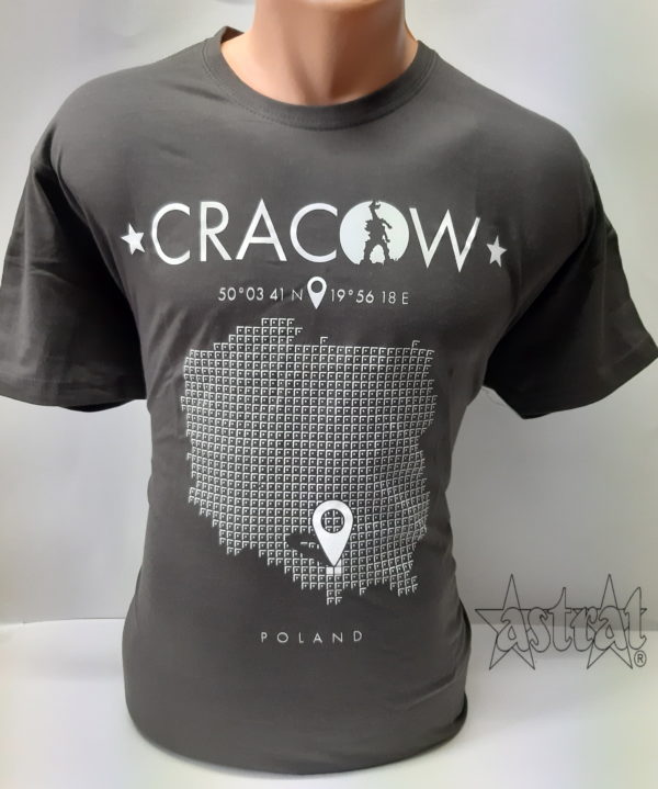 Koszulka w kolorze grafitowym z nadrukiem przedstawiającym mapę Polski i oznaczeniem Krakowa . Wykonana z wysokiej jakości bawełny. Materiał dopasowuje się do ciała, nie rozchodzi w praniu, dobrze się prasuje. Podwójny szew wokół szyi, przy rękawach oraz u dołu koszulki. Bez szwów bocznych. Taśma wzmacniająca wzdłuż karku.