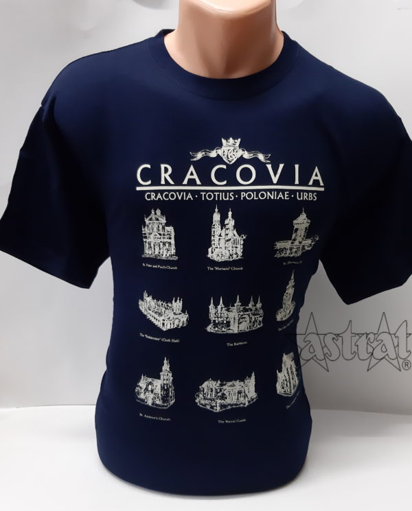 Koszulka w kolorze granatowym z nadrukiem prezentującym zabytki Krakowa. Wykonana z wysokiej jakości bawełny. Materiał dopasowuje się do ciała, nie rozchodzi w praniu, dobrze się prasuje. Podwójny szew wokół szyi, przy rękawach oraz u dołu koszulki. Bez szwów bocznych. Taśma wzmacniająca wzdłuż karku.