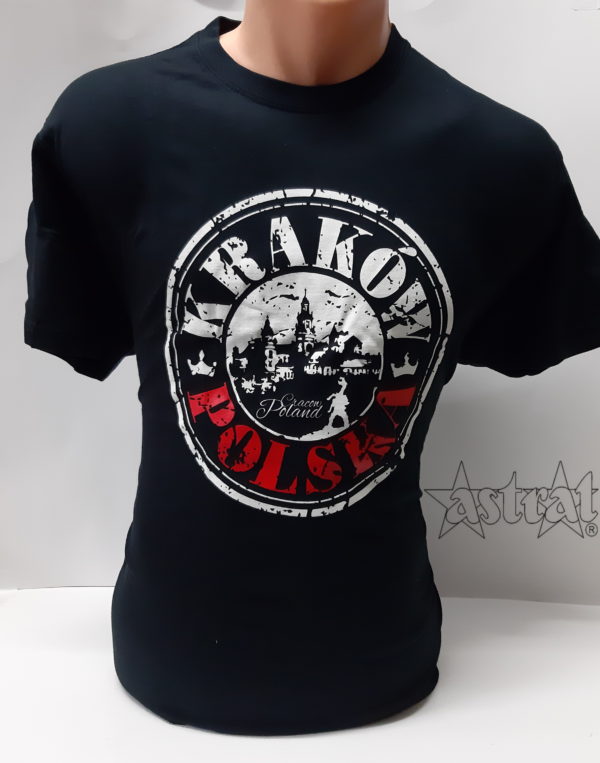 Koszulka w kolorze czarnym z nadrukiem okrągłym na środku. Wykonana z wysokiej jakości bawełny. Materiał dopasowuje się do ciała, nie rozchodzi w praniu, dobrze się prasuje. Podwójny szew wokół szyi, przy rękawach oraz u dołu koszulki. Bez szwów bocznych. Taśma wzmacniająca wzdłuż karku.