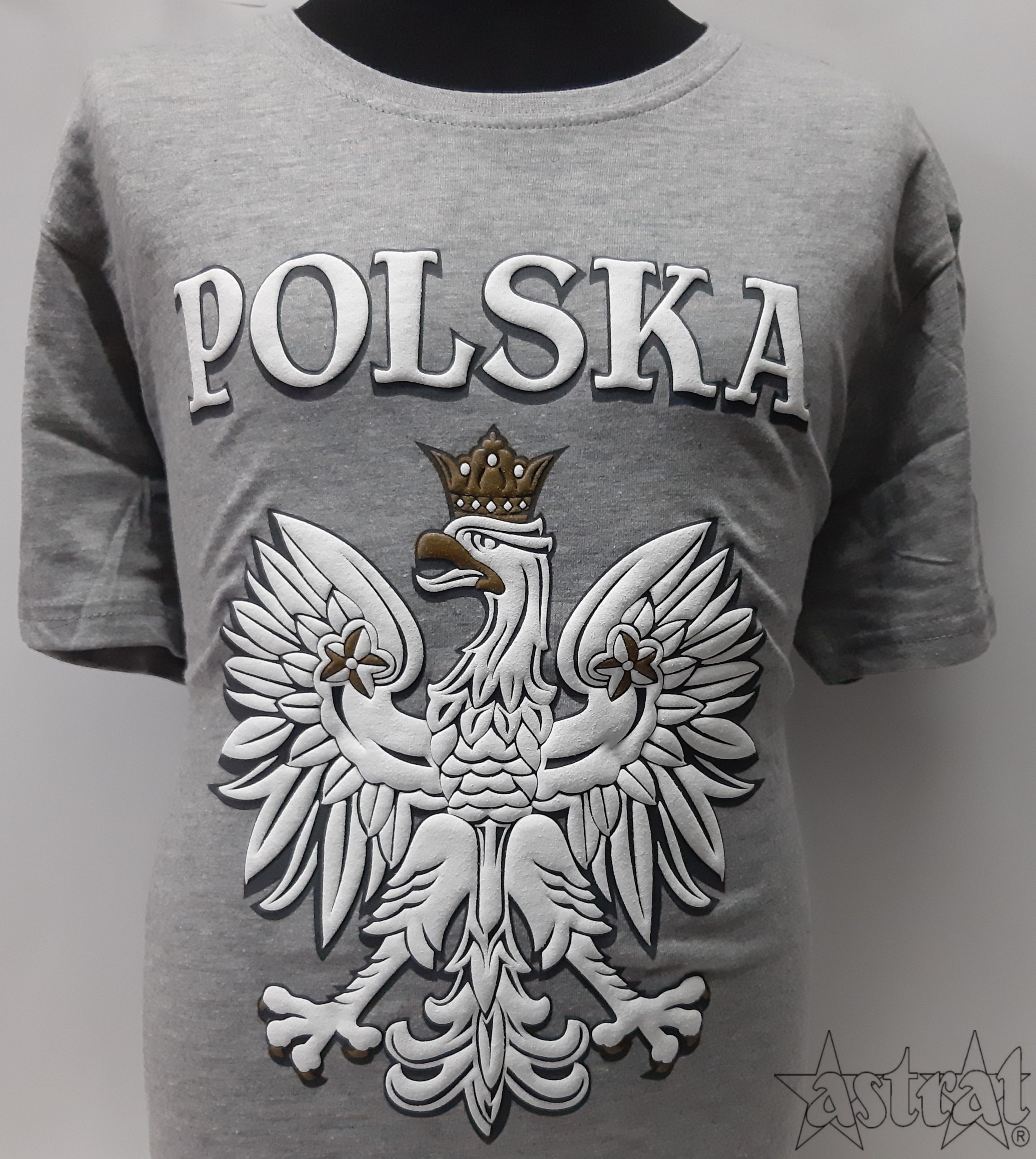 Koszulka dziecięca w kolorze szarym, z nadrukiem przedstawiającym białego orła i napis Polska wokół których jest czarny kontur. Wykonana z wysokiej jakości bawełny. Materiał dopasowuje się do ciała, nie rozchodzi w praniu, dobrze się prasuje. Podwójny szew wokół szyi, przy rękawach oraz u dołu koszulki. Bez szwów bocznych. Taśma wzmacniająca wzdłuż karku.