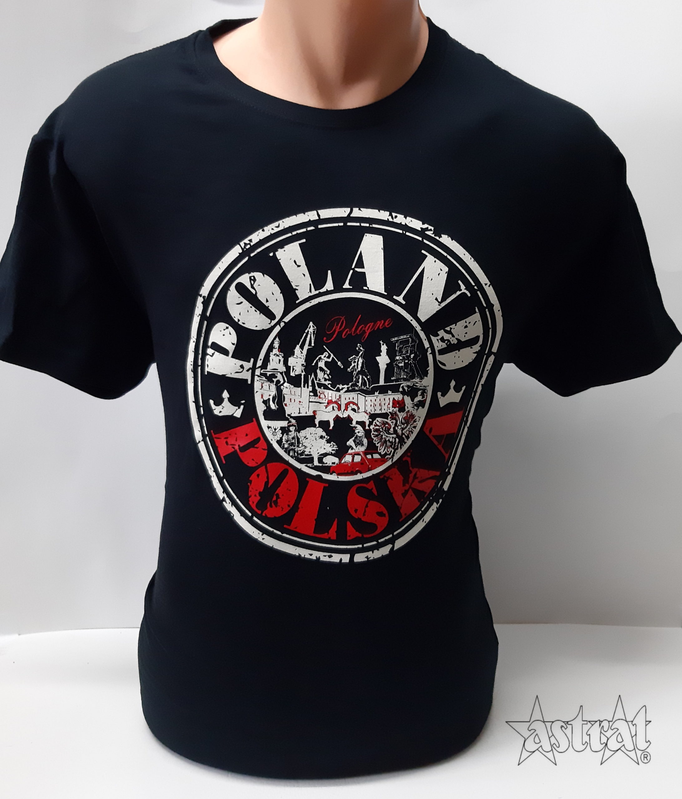 Koszulka w kolorze czarnym z nadrukiem okrągłym na środku. Wykonana z wysokiej jakości bawełny. Materiał dopasowuje się do ciała, nie rozchodzi w praniu, dobrze się prasuje. Podwójny szew wokół szyi, przy rękawach oraz u dołu koszulki. Bez szwów bocznych. Taśma wzmacniająca wzdłuż karku.