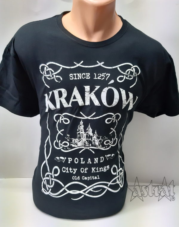 Koszulka w kolorze czarnym z nadrukiem ramki Krakowa. Wykonana z wysokiej jakości bawełny. Materiał dopasowuje się do ciała, nie rozchodzi w praniu, dobrze się prasuje. Podwójny szew wokół szyi, przy rękawach oraz u dołu koszulki. Bez szwów bocznych. Taśma wzmacniająca wzdłuż karku.