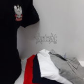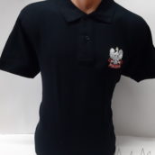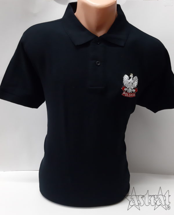 Koszulka polo w kolorze granatowym z nadrukiem białego orła i napisem POLSKA. Wykonana z wysokiej jakości bawełny. Materiał dopasowuje się do ciała, nie rozchodzi w praniu, dobrze się prasuje. Koszulka posiada boczne rozcięcia, oraz ściągacze na rękawach i kołnierzyk. Zapinana jest na dwa guziki