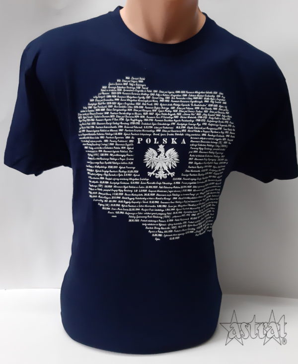 Koszulka w kolorze granatowym z nadrukiem przedstawiającym najważniejsze daty w polskiej historii. Wykonana z wysokiej jakości bawełny. Materiał dopasowuje się do ciała, nie rozchodzi w praniu, dobrze się prasuje. Podwójny szew wokół szyi, przy rękawach oraz u dołu koszulki. Bez szwów bocznych. Taśma wzmacniająca wzdłuż karku.