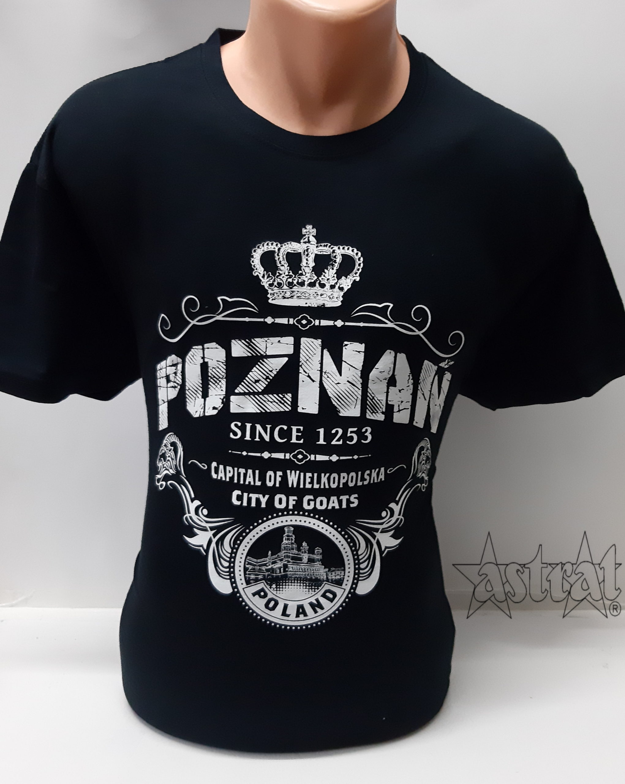 Koszulka w kolorze czarnym z nadrukiem przedstawiającym napis MGM Poznań. Wykonana z wysokiej jakości bawełny. Materiał dopasowuje się do ciała, nie rozchodzi w praniu, dobrze się prasuje. Podwójny szew wokół szyi, przy rękawach oraz u dołu koszulki. Bez szwów bocznych. Taśma wzmacniająca wzdłuż karku.