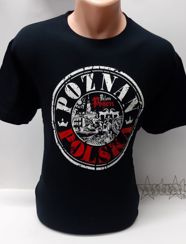 Koszulka w kolorze czarnym z nadrukiem okrągłym na środku. Wykonana z wysokiej jakości bawełny. Materiał dopasowuje się do ciała, nie rozchodzi w praniu, dobrze się prasuje. Podwójny szew wokół szyi, przy rękawach oraz u dołu koszulki. Bez szwów bocznych. Taśma wzmacniająca wzdłuż karku.