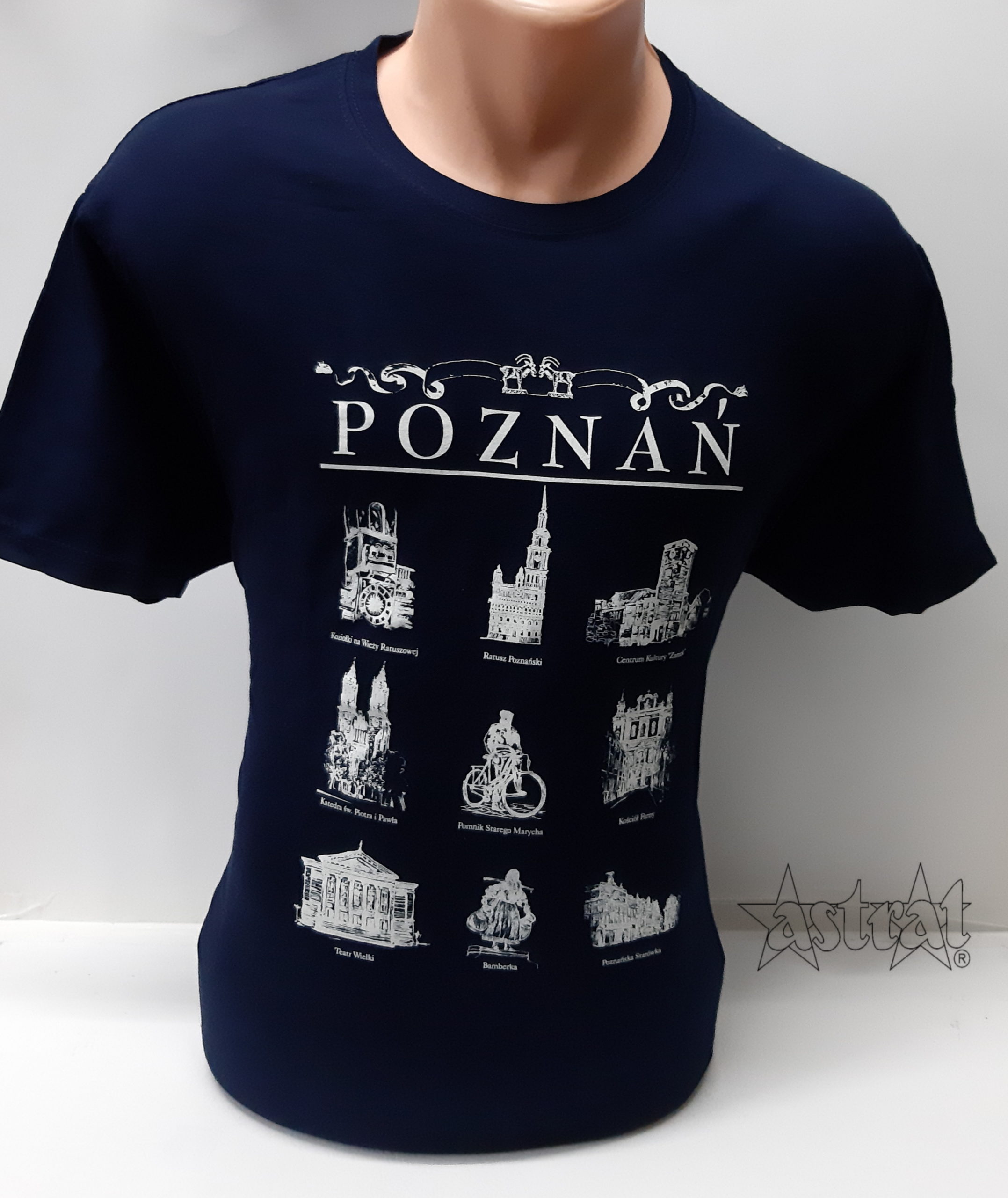 Koszulka w kolorze granatowym z nadrukiem prezentującym zabytki Poznania.