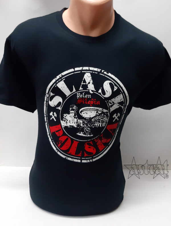 Koszulka w kolorze czarnym z nadrukiem okrągłym na środku. Wykonana z wysokiej jakości bawełny. Materiał dopasowuje się do ciała, nie rozchodzi w praniu, dobrze się prasuje. Podwójny szew wokół szyi, przy rękawach oraz u dołu koszulki. Bez szwów bocznych. Taśma wzmacniająca wzdłuż karku.