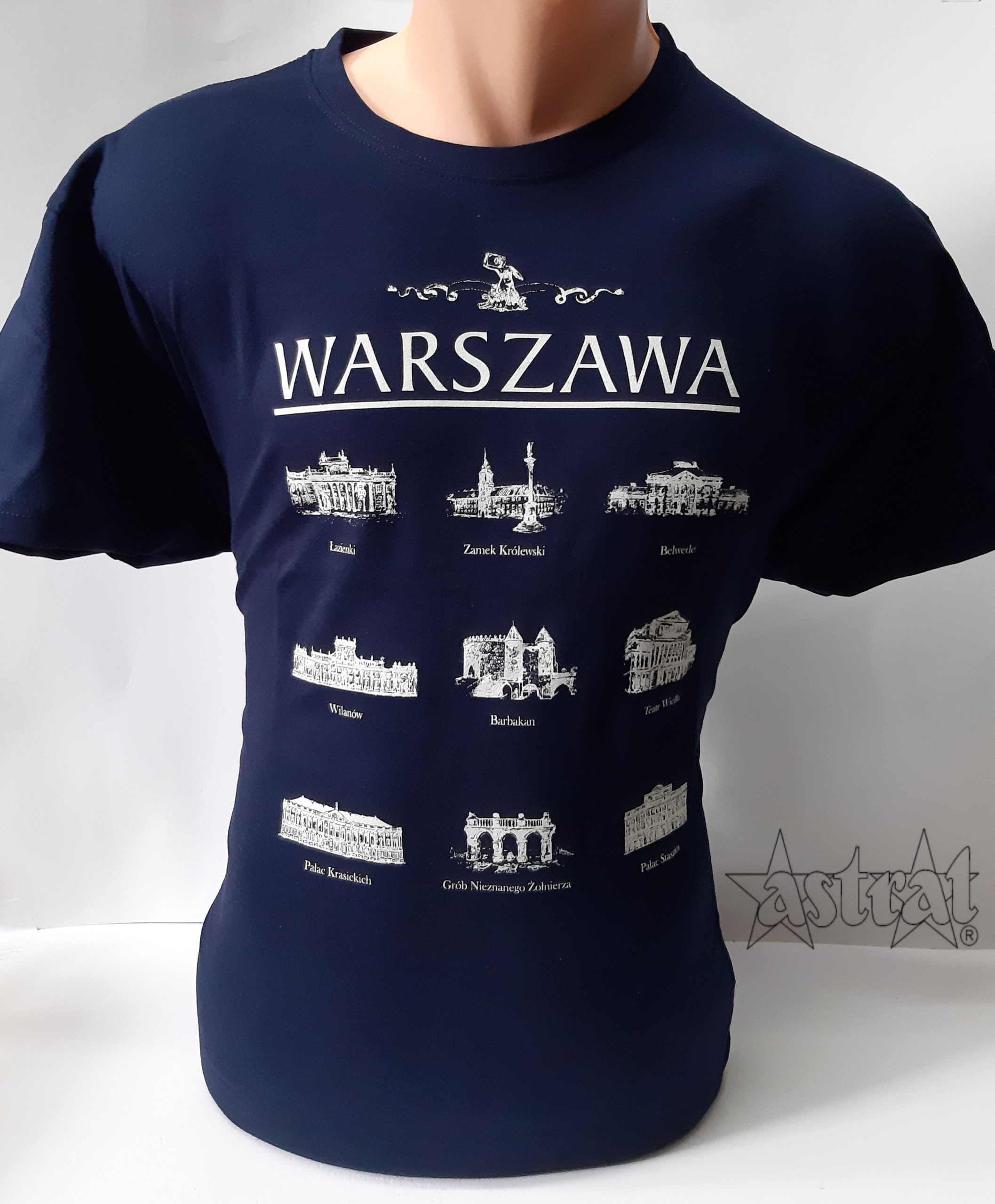 Koszulka w kolorze granatowym z nadrukiem przestawiającym zabytki Warszawy.. Wykonana z wysokiej jakości bawełny. Materiał dopasowuje się do ciała, nie rozchodzi w praniu, dobrze się prasuje. Podwójny szew wokół szyi, przy rękawach oraz u dołu koszulki. Bez szwów bocznych. Taśma wzmacniająca wzdłuż karku.