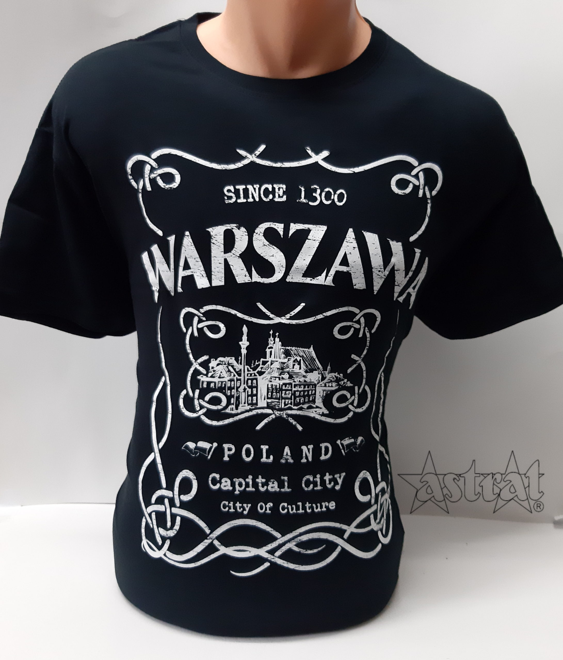Koszulka w kolorze czarnym z nadrukiem ramki Warszawa. Wykonana z wysokiej jakości bawełny. Materiał dopasowuje się do ciała, nie rozchodzi w praniu, dobrze się prasuje. Podwójny szew wokół szyi, przy rękawach oraz u dołu koszulki. Bez szwów bocznych. Taśma wzmacniająca wzdłuż karku.