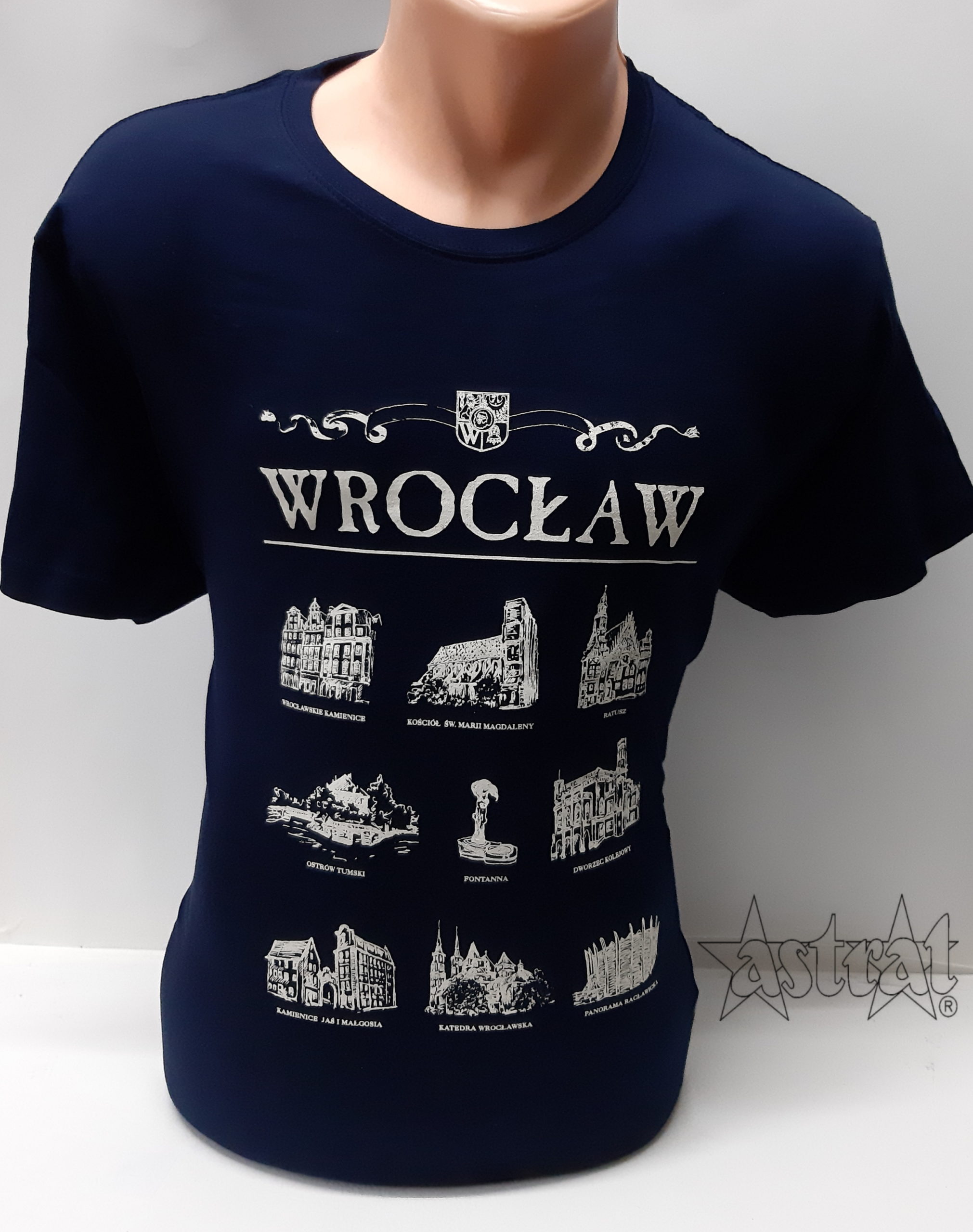 Koszulka w kolorze granatowym z nadrukiem ramki Katowic. Wykonana z wysokiej jakości bawełny. Materiał dopasowuje się do ciała, nie rozchodzi w praniu, dobrze się prasuje. Podwójny szew wokół szyi, przy rękawach oraz u dołu koszulki. Bez szwów bocznych. Taśma wzmacniająca wzdłuż karku.