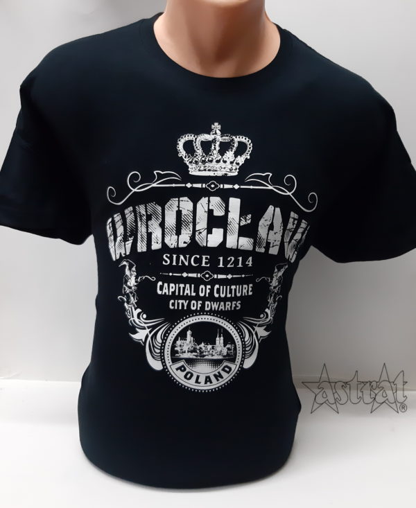 Koszulka w kolorze czarnym z nadrukiem przedstawiającym napis MGM Wrocław. Wykonana z wysokiej jakości bawełny. Materiał dopasowuje się do ciała, nie rozchodzi w praniu, dobrze się prasuje. Podwójny szew wokół szyi, przy rękawach oraz u dołu koszulki. Bez szwów bocznych. Taśma wzmacniająca wzdłuż karku.