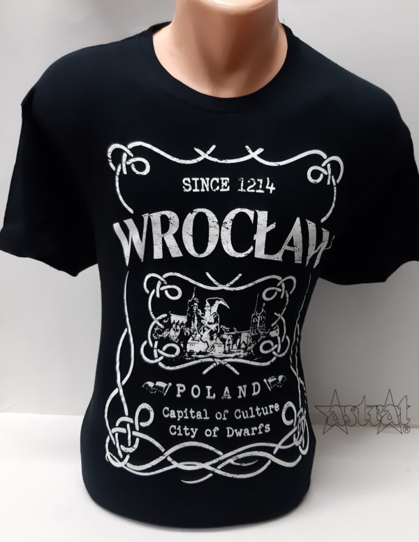 Koszulka w kolorze czarnym z nadrukiem ramki Wrocławia. Wykonana z wysokiej jakości bawełny. Materiał dopasowuje się do ciała, nie rozchodzi w praniu, dobrze się prasuje. Podwójny szew wokół szyi, przy rękawach oraz u dołu koszulki. Bez szwów bocznych. Taśma wzmacniająca wzdłuż karku.