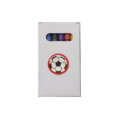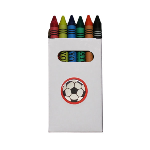Zestaw sześciu kredek woskowych w tekturowym pudełeczku. Dostępne kolory: zielony, czarny, żółty, niebieski, czerwony, fioletowy.