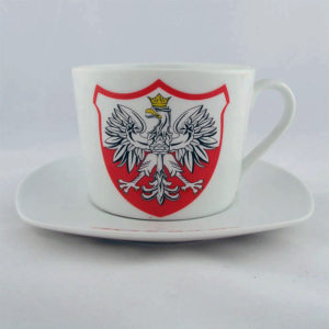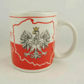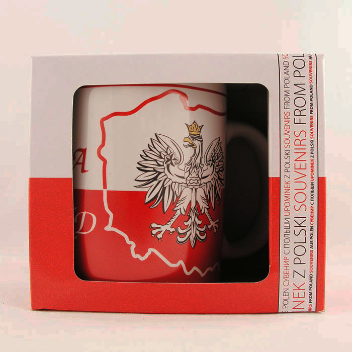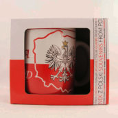 Biało-czerwony kubek ceramiczny z orłem na tle mapy Polski oraz napisami Polska i Poland. Kubek zapakowany jest w ozdobne papierowe pudełko w barwach narodowych.