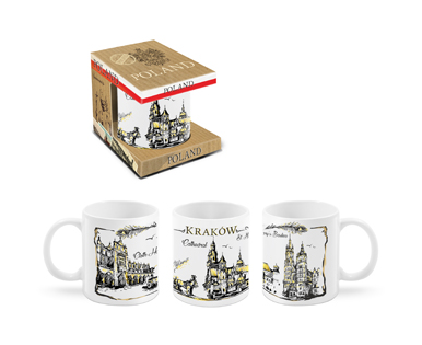 Kubek ceramiczny biały ozdobiony grafiką pozłacaną przedstawiającą Sukiennice, Katedrę Wawelską oraz Kościół Mariacki.. Kubek zapakowany jest w ładne tekturowe pudełko.