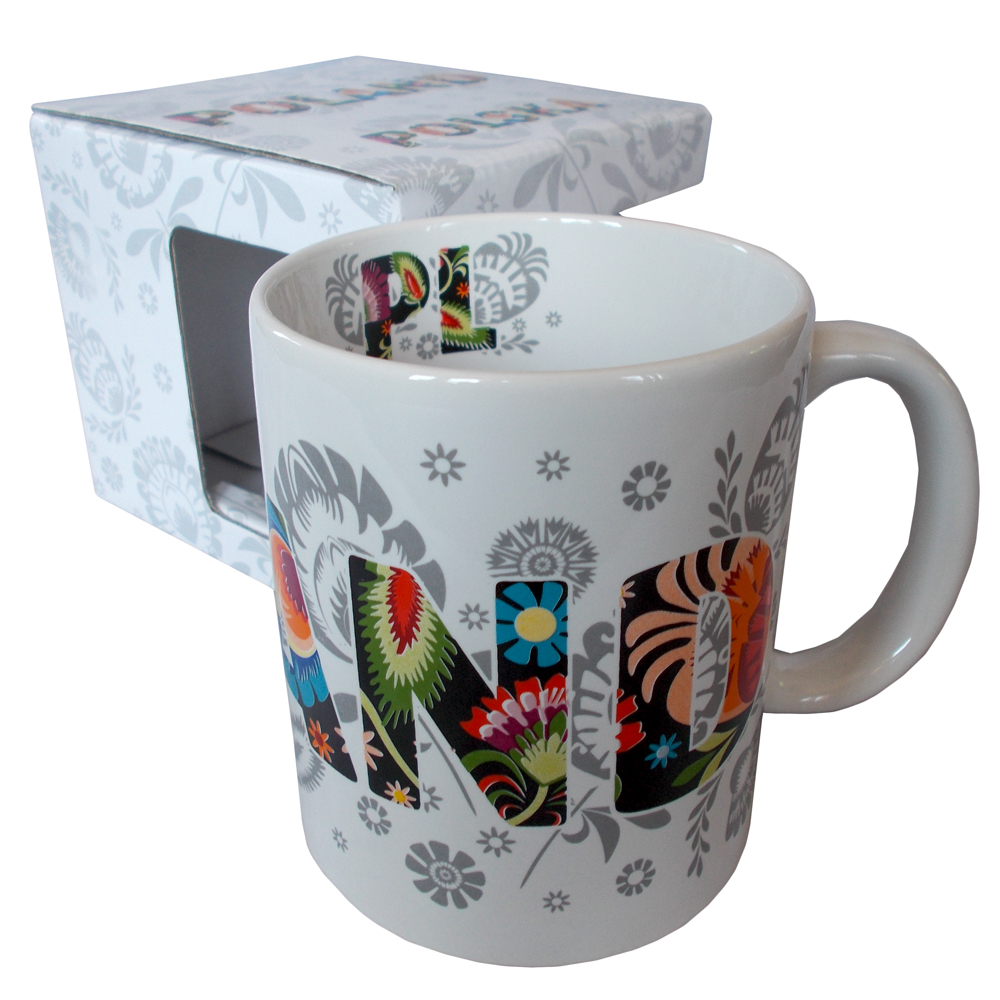 Biały kubek ceramiczny ozdobiony wzorami kwiatowymi oraz napisem “Poland”. Kubek zapakowany jest w ozdobne kartonowe pudełko.