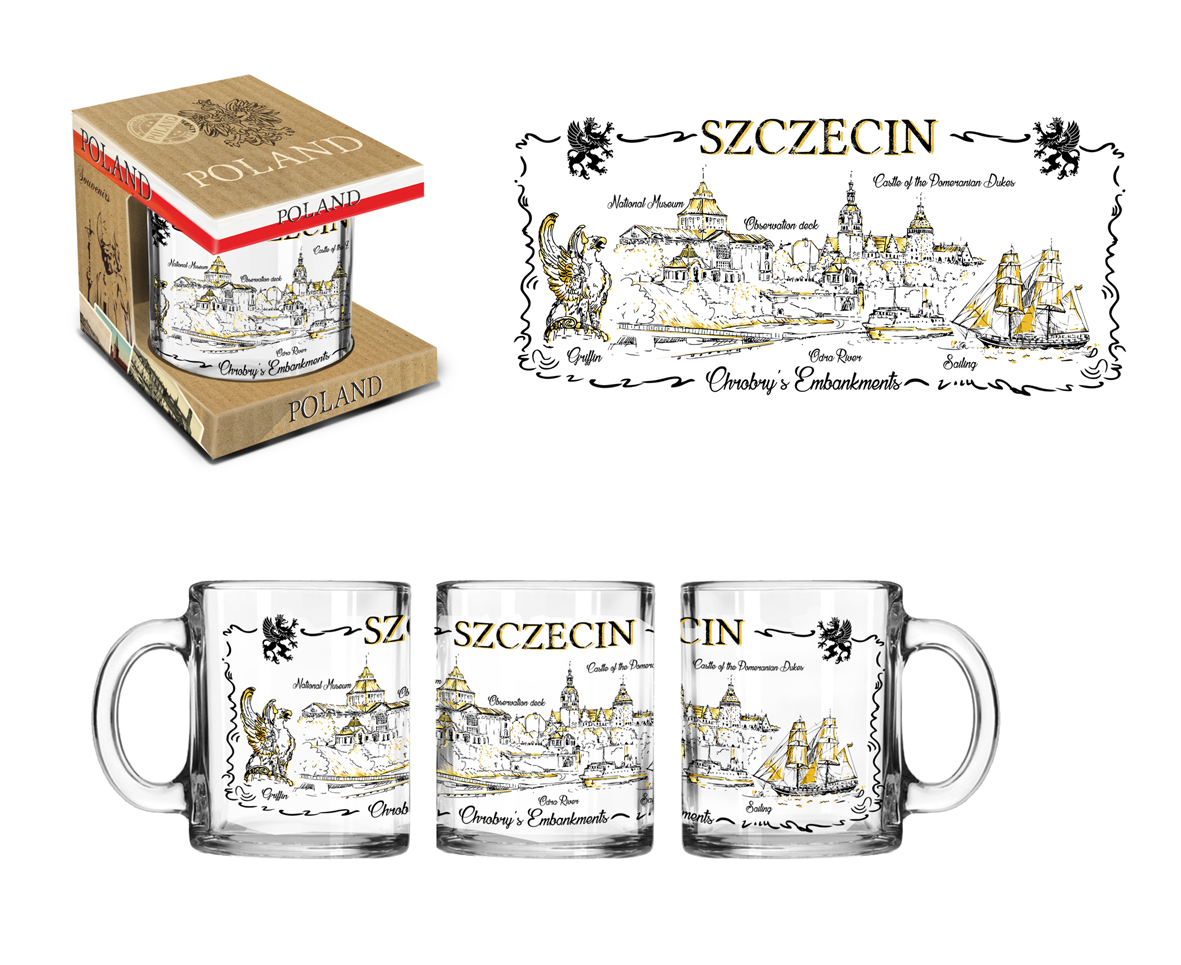 Kubek szklany szroniony ozdobiony grafiką pozłacaną przedstawiającą panoramę na Wały Chrobrego w Szczecinie. Kubek zapakowany jest w ładne tekturowe pudełko.