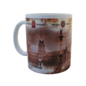 Biały kubek ceramiczny ozdobiony nadrukiem przedstawiającym zdjęcia Placu Zamkowego oraz Pałacu Łazienkowskiego. U góry kubka pokazano herb Warszawy oraz Polski.