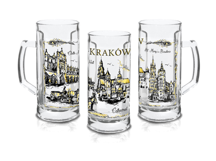 Szklany kufel o pojemności 0,3 l. Ozdobiony grafiką pozłacaną przedstawiającą Sukiennice, Katedrę Wawelską oraz Kościół Mariacki.
