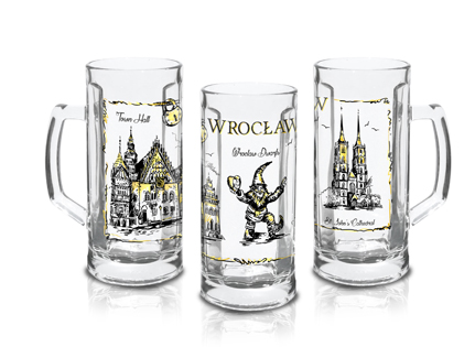 Szklany kufel o pojemności 0,3 l. Ozdobiony grafiką pozłacaną przedstawiającą Ratusz, Krasnala oraz Katedrę.