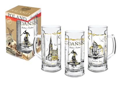 Szklany kufel o pojemności 0,5 l. Ozdobiony grafiką pozłacaną przedstawiającą Ratusz, pomnik Neptuna oraz Żuraw. Kufel zapakowany jest w ładne tekturowe pudełko.