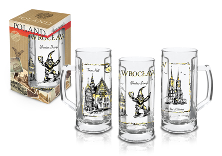 Szklany kufel o pojemności 0,5 l. Ozdobiony grafiką pozłacaną przedstawiającą Ratusz, Krasnala oraz Katedrę. Kufel zapakowany jest w ładne tekturowe pudełko.