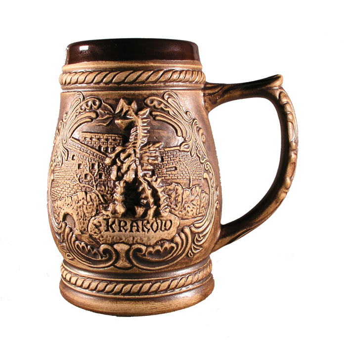 Kufel z gliny, wewnątrz szkliwiony, wypalany. Ozdobiony wizerunkiem Smoka Wawelskiego i Wawelu.