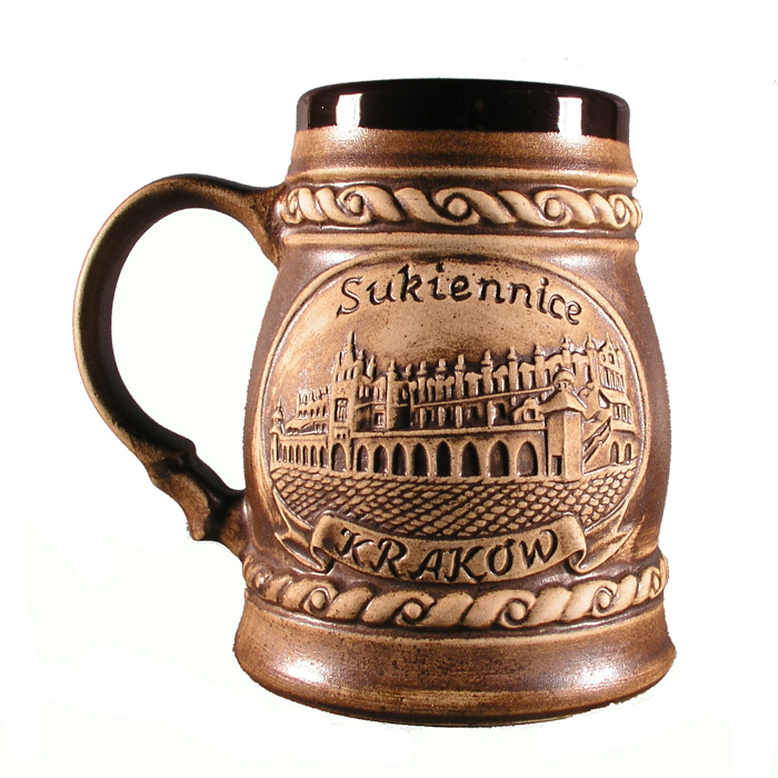 Kufel z gliny, wewnątrz szkliwiony, wypalany. Ozdobiony wizerunkiem krakowskich Sukiennic i ratusza.