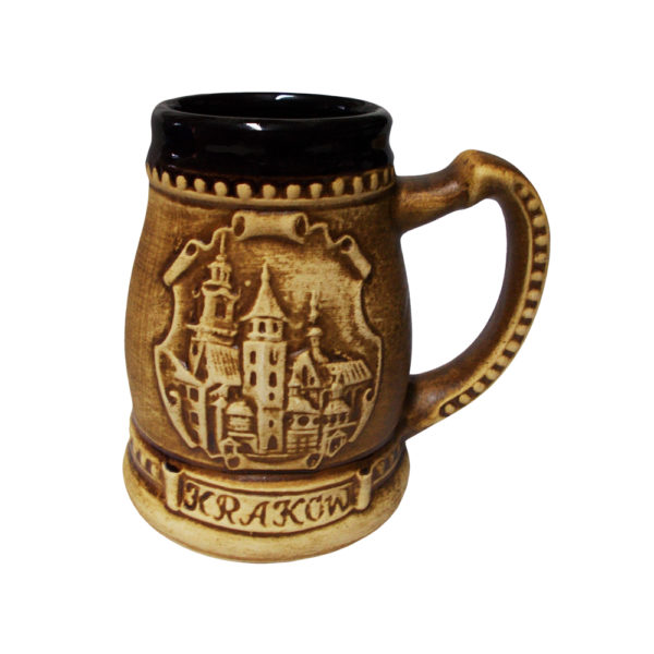 Kufel z gliny, wewnątrz szkliwiony, wypalany. Ozdobiony z jednej strony “K” w koronie z drzwi Katedry Wawelskiej i wizerunkiem Katedry na Wawelu z drugiej.
