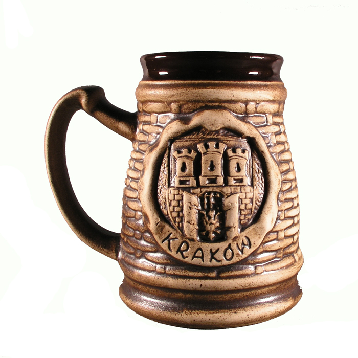 Kufel z gliny, wewnątrz szkliwiony, wypalany. Ozdobiony herbem Krakowa z jednej strony i Kościołem Mariackim z drugiej.