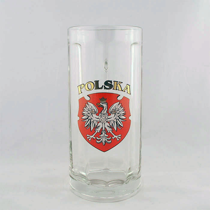 Szklany kufel o pojemności 0,3 l. Ozdobiony nadrukiem przedstawiającym orła na tle czerwonej tarczy i złotym napisem Polska.