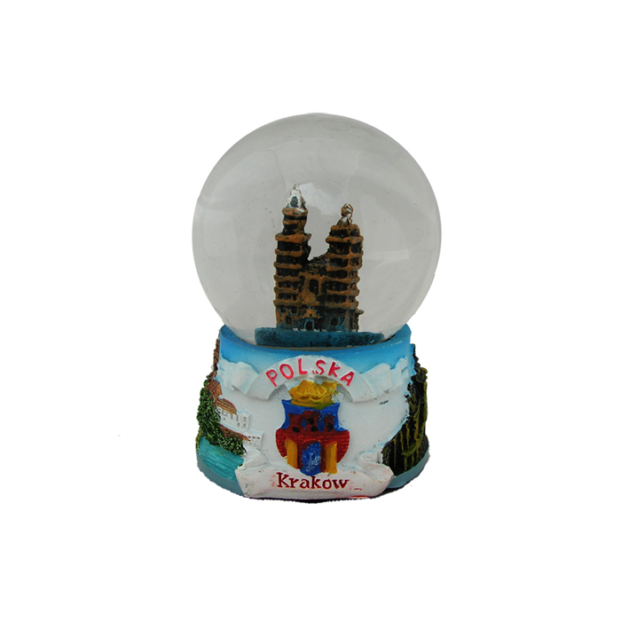 Szklana kula śnieżna wypełniona wodą z figurką kościoła Mariackiego w środku. Figurka wykonana z syntetycznej żywicy. Podstawa ozdobiona kolorowymi płaskorzeźbami herbu Krakowa, Sukiennic, Barbakanu oraz Wawelu.