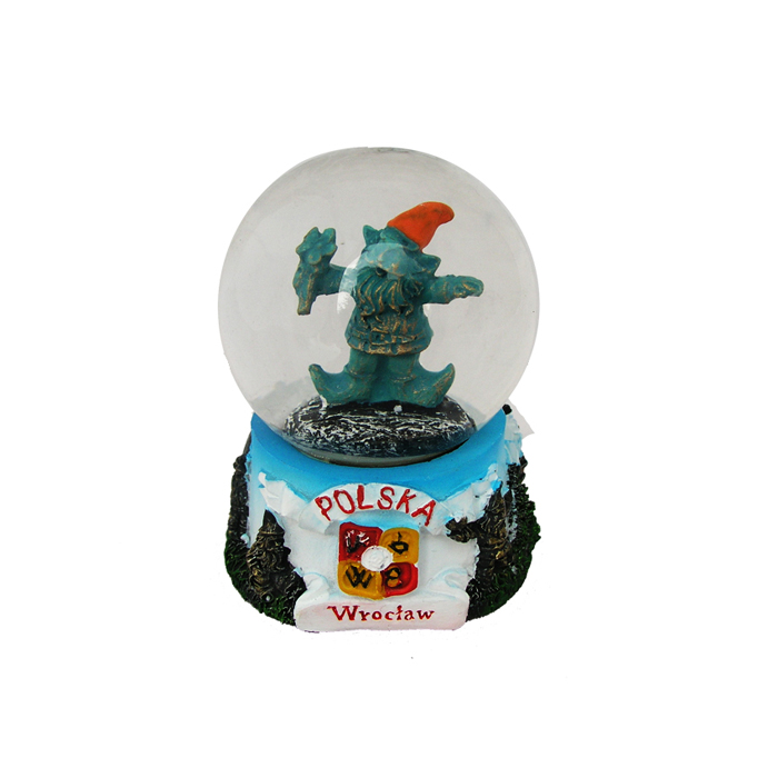 Szklana kula śnieżna wypełniona wodą z figurką wrocławskiego Krasnala w środku. Figurka wykonana z syntetycznej żywicy. Podstawa ozdobiona kolorowymi płaskorzeźbami herbu Wrocławia, ratusza, kamienic na rynku oraz krasnali.