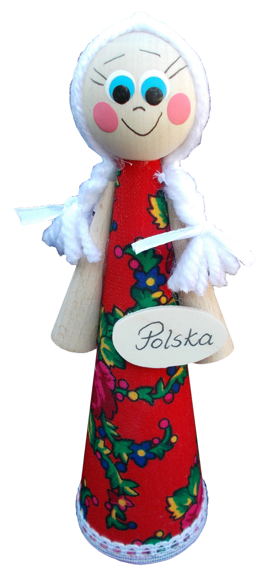 Drewniana laleczka ozdobiona wzorami folklorystycznymi trzymająca tabliczkę z napisem Polska