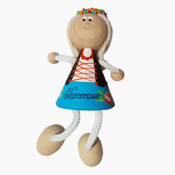 Drewniana lalka w namalowanym stroju ludowym z napisem Warszawa. Lalka w różnych kolorach.