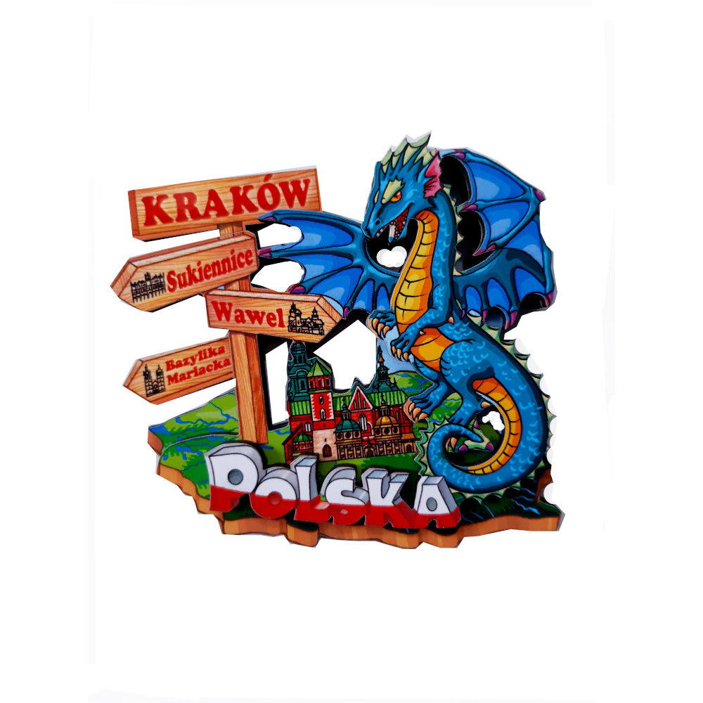 Magnes drewniany wykonany w dobrej jakości sklejki, w postaci kierunkowskazów zabytków Krakowa oraz ze smokiem i napisem Polska