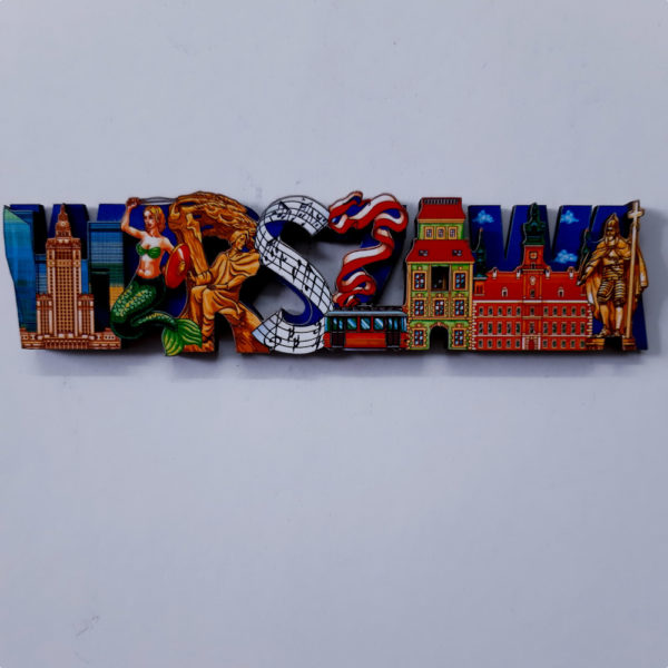 Kolorowy magnes, wykonany z dobrej jakości sklejki, postaci napisu Warszawa