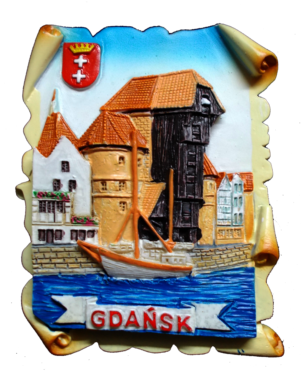 Magnes ceramiczny ręcznie malowany przedstawiający gdański Żuraw na Długim Pobrzeżu.