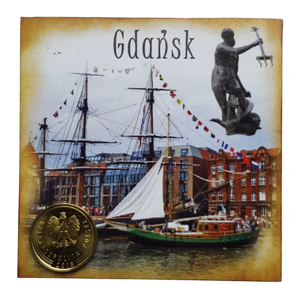 Drewniany magnes z grafiką przedstawiającą statki żaglowe na Długim Pobrzeżu w Gdańsku, z dołączonym groszem.