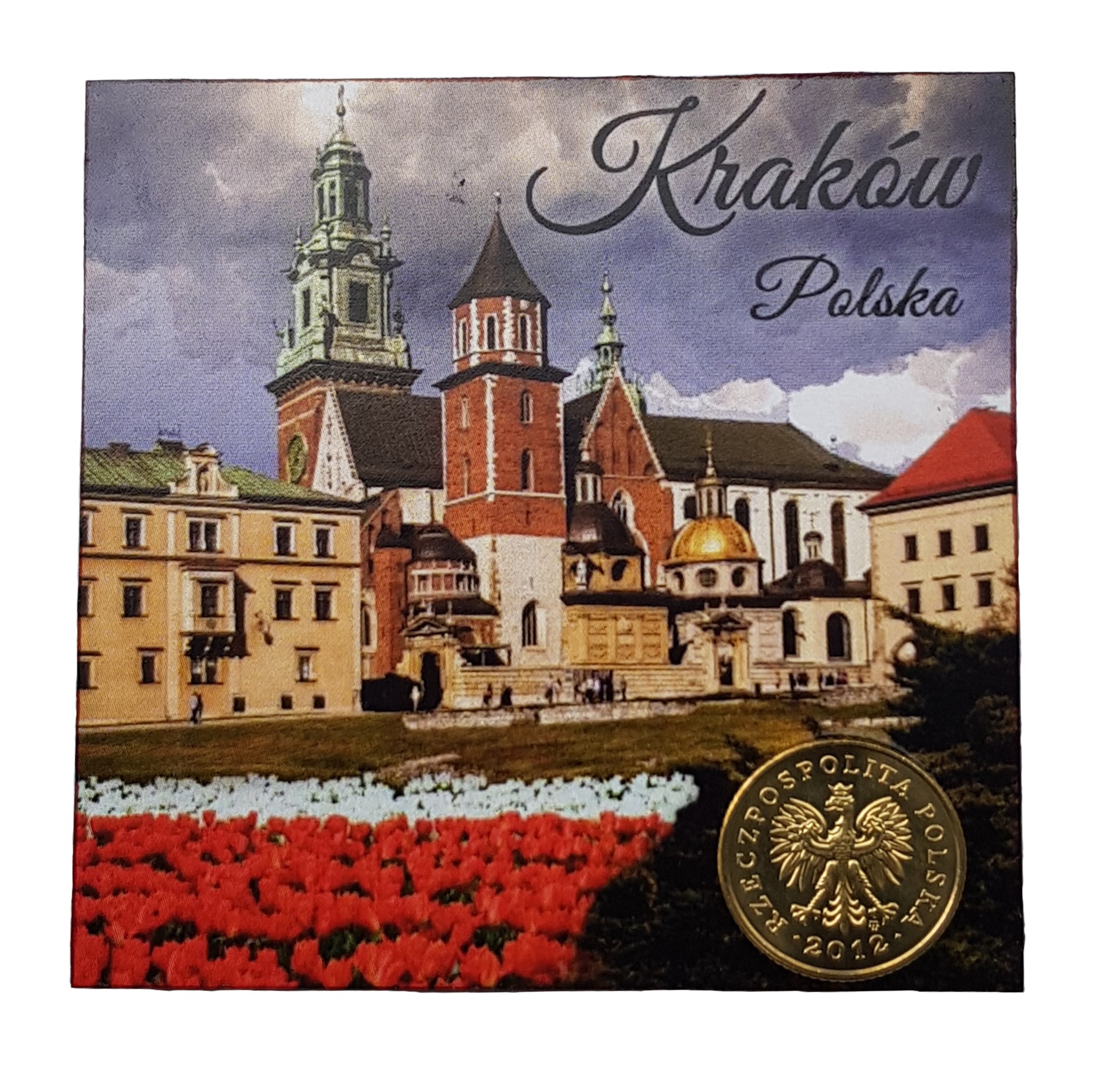 Drewniany magnes z grafiką przedstawiającą Katedrę na Wawelu w Krakowie, z dołączonym groszem.