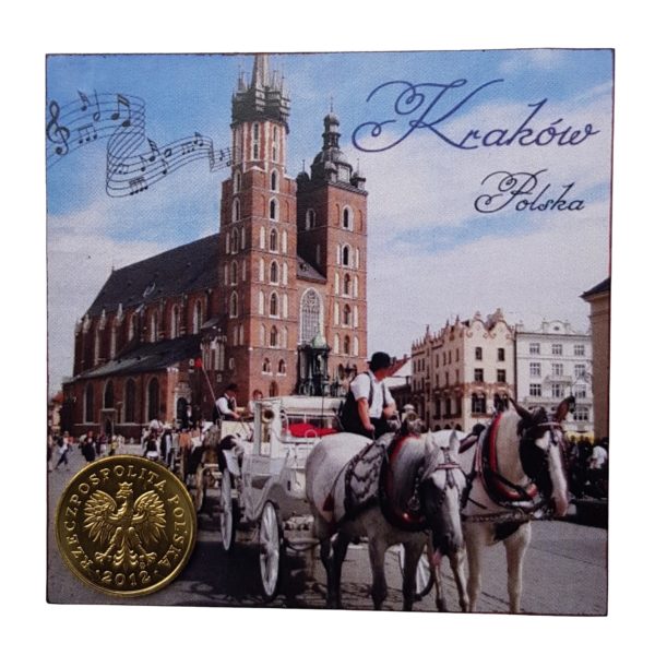 Drewniany magnes z grafiką przedstawiającą Kościół Mariacki Krakowie, z dołączonym groszem.