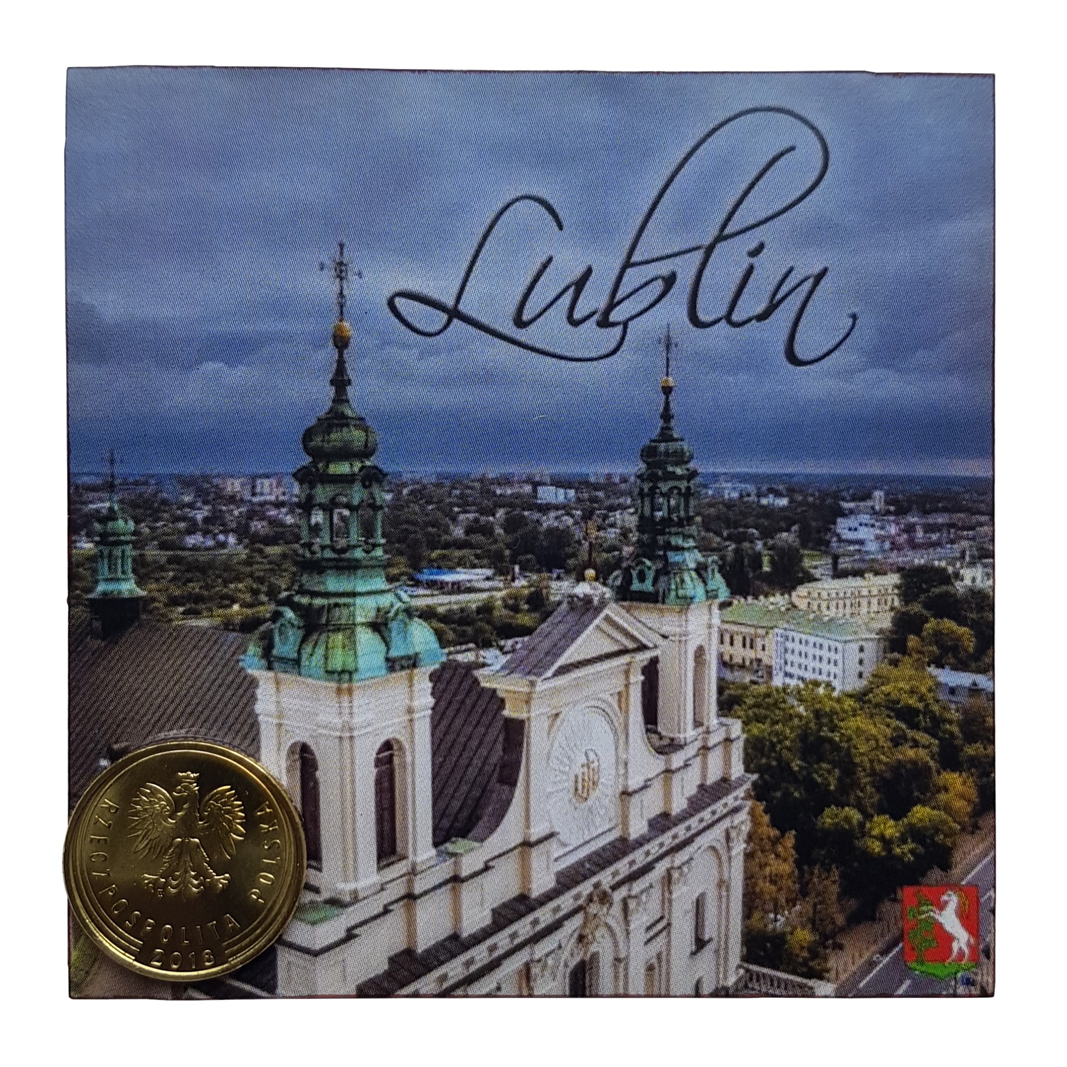 Drewniany magnes z grafiką przedstawiającą Archikatedra św. Jana Chrzciciela i św. Jana Ewangelisty w Lublinie, z dołączonym groszem.