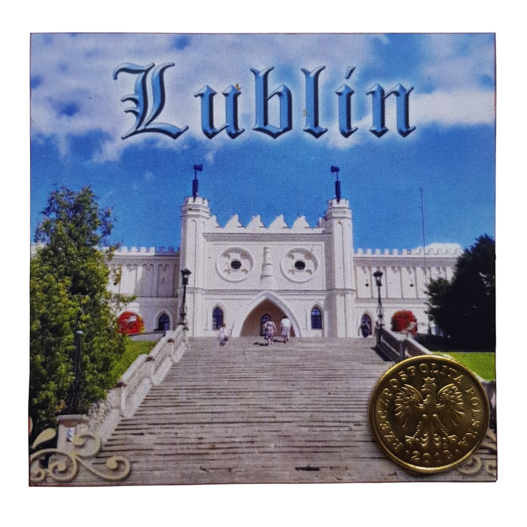 Drewniany magnes z grafiką przedstawiającą Zamek w Lublinie, z dołączonym groszem.
