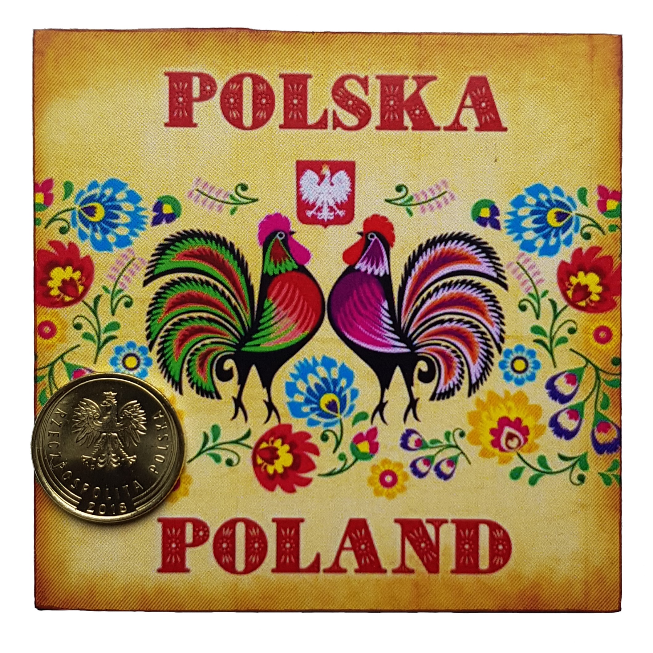 Drewniany magnes z grafiką przedstawiającą koguty z motywem folklorystycznym, z dołączonym groszem.