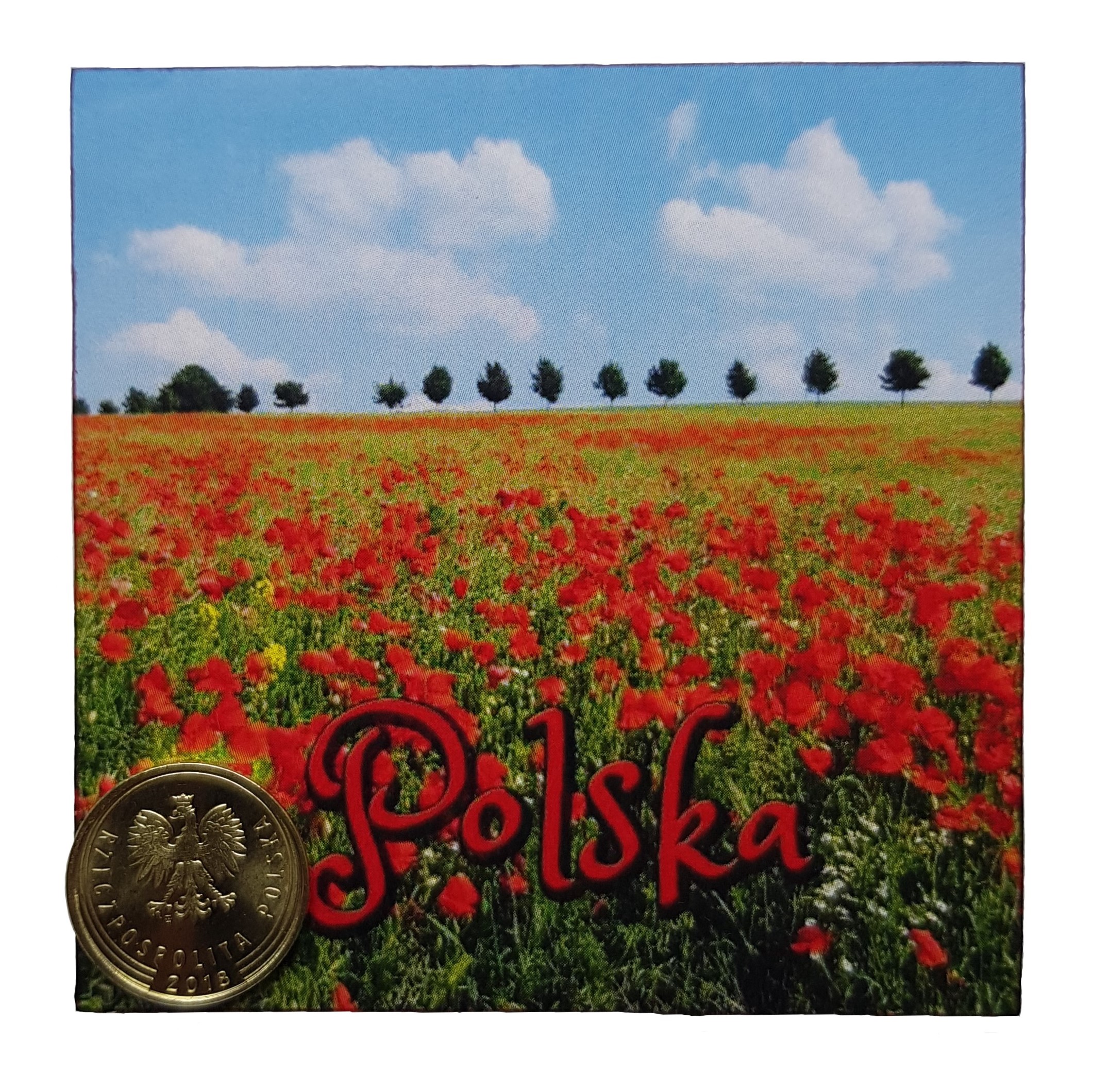 Drewniany magnes z grafiką przedstawiającą pole maków, z dołączonym groszem.