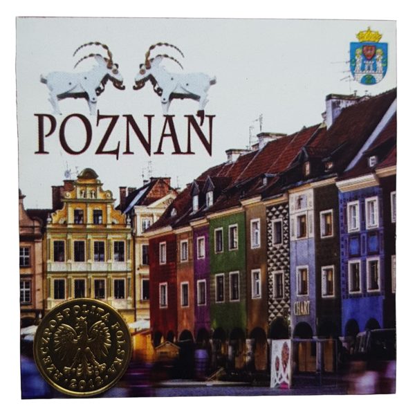 Drewniany magnes z grafiką przedstawiającą kamieniczki na Rynku w Poznaniu, z dołączonym groszem.