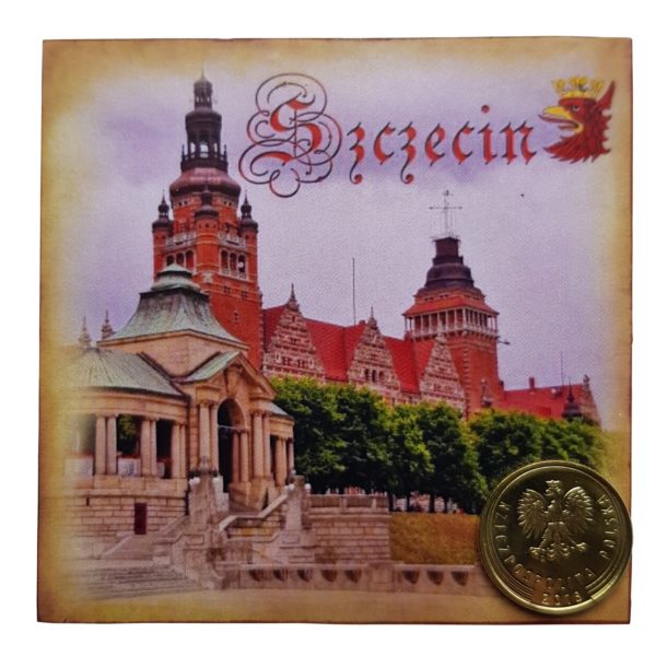 Drewniany magnes z grafiką przedstawiającą Wały Chrobrego w Szczecinie, z dołączonym groszem.