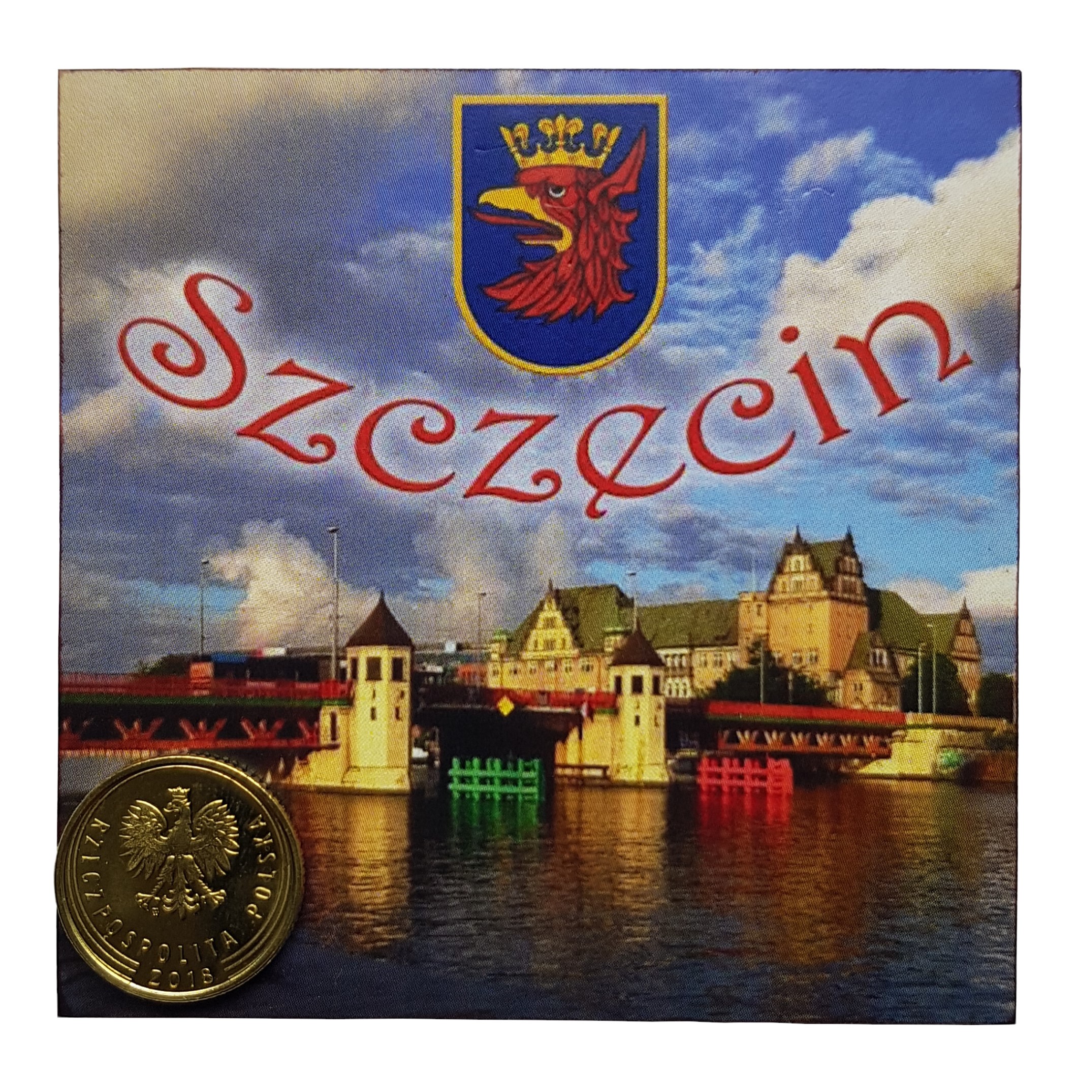 Drewniany magnes z grafiką przedstawiającą Wały Chrobrego w Szczecinie, z dołączonym groszem.