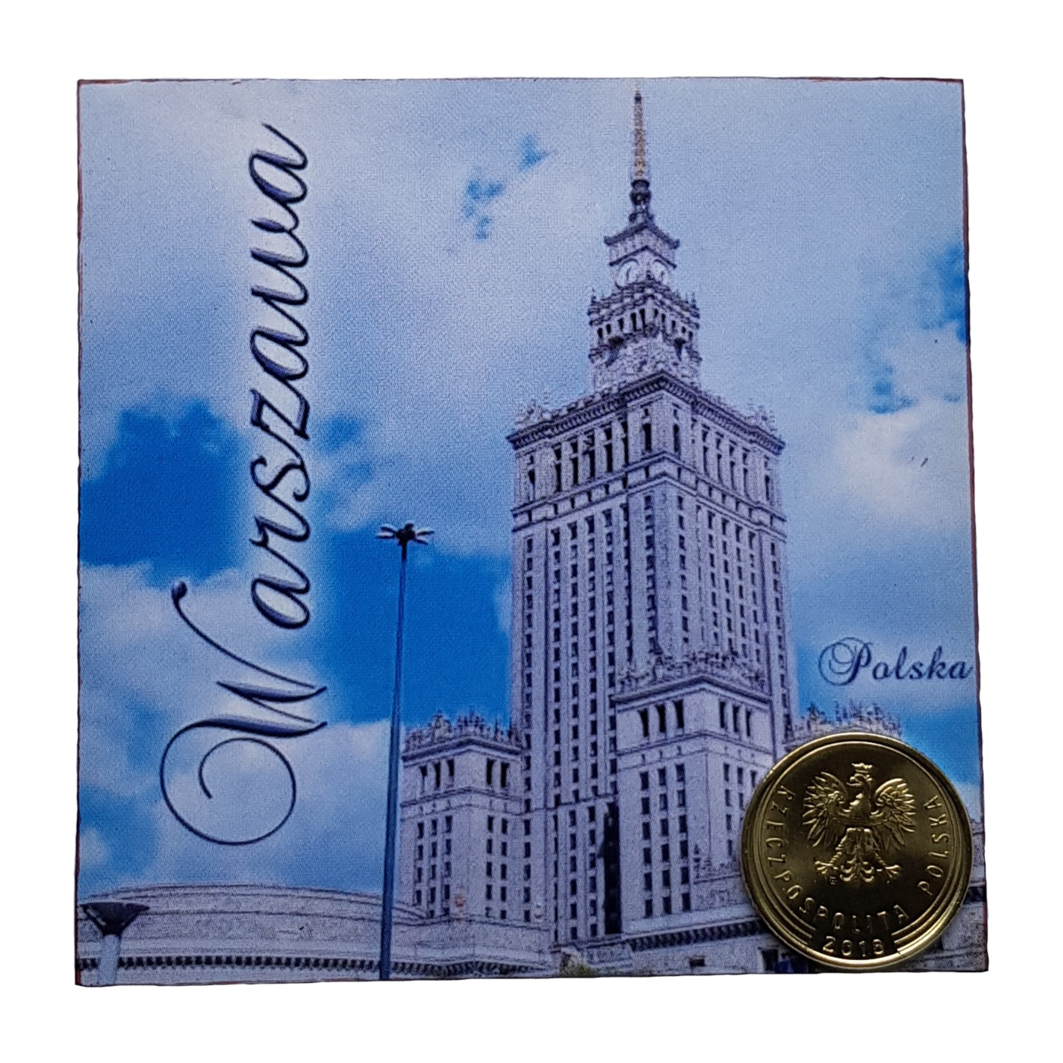 Drewniany magnes z grafiką przedstawiającą Pałac Kultury I Nauki w Warszawie, z dołączonym groszem.